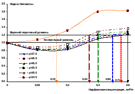 Результаты экспериментов свидетельствуют о неоднозначном проявлении биологической активности различных органических поллютантов при закислении водной среды. Так, например, токсичность для личинок окуня компонентов буровых растворов (пропиленгликоль и продукт EC6029-А) по градиенту рН несколько снижается, оставаясь в переделах порогового уровня толерантности. Для дизельного топлива характерно существенное увеличение токсичности, а для бензина - снижение, достигающее биологически значимых по сравнению с нейтральной средой различий в диапазоне рН 5.0-4.0. Достоверное снижение токсичности гербицида Бетарен начинается с рН 5.5, а токсичность гербицида Голтикс увеличивается с превышением порогового уровня толерантности при рН 5.0-4.0.