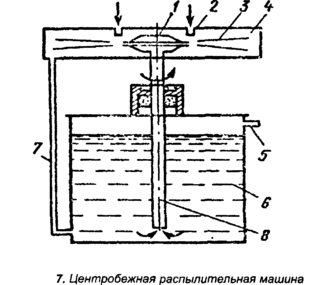 Для интенсификации окисления применяют кавитирующий эффект, который достигается в кавитационном аэраторе или в центробежной распылительной машине, а также при использовании ультразвуковой энергии. Наибольшее окисление достигается в центробежной распылительной машине, где интенсивность механических колебаний в зоне смешения достигает 57 Вт/см2. Особенностью конструкции являются диски-распылители 1, установленные в камере смешения 4. При заданной частоте вращения дисков-распылителей 42 м/с возникает кавитация. Обрабатываемая вода, подаваемая через патрубки 2, всасывается через полый вал 8, диспергируется дисками, образуя на выходе из зазора между дисками тонкую пленку. Обработанная вода выводится через патрубок 5. Пленка проходит между стационарными направляющими 3, распыляется на капли и пузырьки, которые смешиваются с озонированным воздухом, вводимым через боковые патрубки. Озонированная вода 6 по трубопроводу 7 возвращается в цикл.