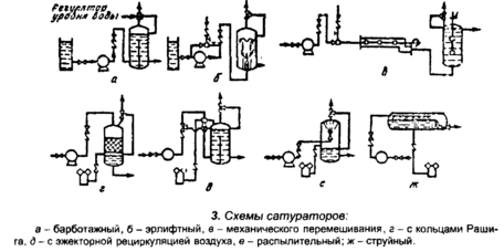 Применяемые в отечественной и зарубежной практике сатураторы представлены на р и с. 3. Недостатком сатураторов является введение воздуха в насос, что снижает его производительность и КПД при увеличенном кавитационном износе. Более эффективны сатураторы, в которых воздух вводится после насоса. Для повышения эффективности используется насадочный сатуратор с кольцами Рашига, а также распылительный и струйный сатураторы.