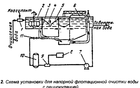Установка с рециркуляцией работает следующим образом. Вода, смешанная с коагулятором в смесителе 1, поступает в камеру 2 хлопьеобразования с лопастной мешалкой, где образуются крупные хлопья коагулянта, сорбирующие коллоидные взвеси. Из камеры 2 коагулированная вода со скоростью 0,2–0,5 м/с перетекает по трубе 3 в центральную камеру 4. В трубу 3 врезан трубопровод, по которому со скоростью 1–2 м/с вводится вода, пересыщенная воздухом. Часть воды, очищенная во флотаторе насосом 7, подается под давлением в смеситель 9, куда компрессором 8 вводится сжатый воздух, и затем в сатуратор 10. В сатураторе за 1–3 мин происходит насыщение воды воздухом и отделение нерастворившего-ся воздуха. Насыщенная вода после снижения давления в дросселирующем устройстве 11 становится пересыщенной и поступает во флотатор. Тонкий слой пены со взвесью собирается скребком 6 в приемный бункер 5.