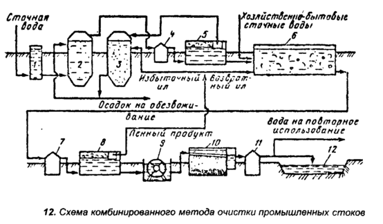 По анаэробной схеме стоки, пройдя усреднитель 1, подаются в анаэробный восстановитель 2, где взаимодействуют с анаэробным илом. Затем смесь насосами 4 подается во флотатор 5, из которого иловая вода вместе с бытовыми водами поступает в аэротенк 6, а пенный продукт – в метантенк 3 на стабилизацию. Выходящая из аэротенка 6 смесь насосами 7 подается во флотатор 8, из которого аэробный активный ил возвращается на вход схемы. Часть ила возвращается в аэротенк 6, а избыточная часть в метантенк 3. Биологически очищенная вода доочищается на фильтрах 9 и 10, после чего сбрасывается в водоем 12 или подается насосами на повторное использование.