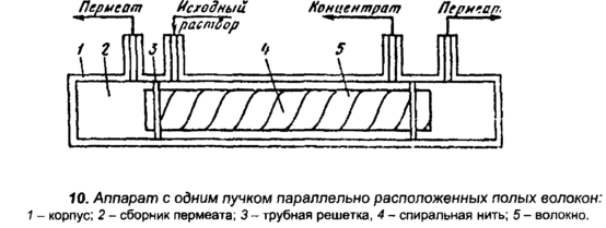 Аппараты с мембранами в виде полых волокон благодаря развитой удельной проницаемости и удельной поверхности нашли широкое применение при разделении сред обратным осмосом и ультрафильтрацией.
