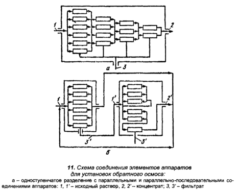 Из схем соединения модулей одноступенчатые соединения аппаратов используют при разделении низкоконцентрированных растворов, а многоступенчатые – при очистке более концентрированных растворов. В этом случае исходным раствором для следующей ступени служит фильтрат предыдущей ступени, которая работает при более низком давлении.