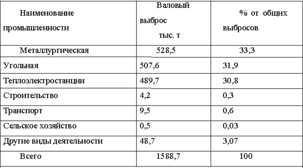 Угольные шахты, металлургические комбинаты, коксохимические заводы, машиностроительные предприятия, теплоэлектростанции является основными загрязнителями атмосферного воздуха [2,31].