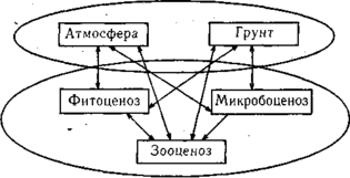 Компоненты биогеоценоза: биотоп и биоценоз (рис.1). Биотоп — однородное по адиатическим факторам среды пространство, занятое биоценозом, т. е. место жизни вида, организма.