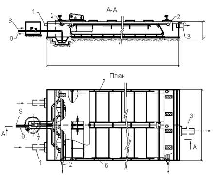 1 – трубопровод для подачи сточных вод на очистку; 2 – нефтесборная труба; 3 – трубопровод для отвода осветленных сточных вод; 4 – гидроэлеватор; 5 – скребковый транспортер левый; 6 – скребковый транспортер правый; 7 – задвижки с электроприводом во взрывобезопасном исполнении; 8 – трубопровод для подачи воды к гидроэлеватору; 9 – трубопровод для отвода осадка.