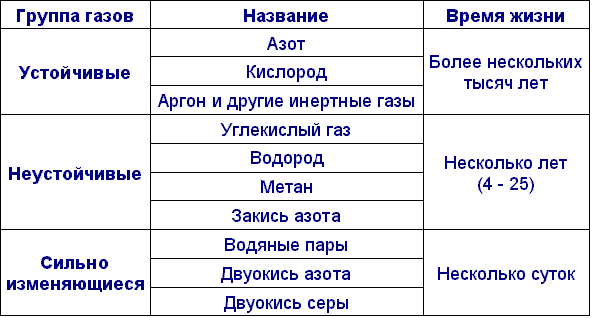 В таблице приведен газовый состав атмосферы в объемном массовом отношении, а также время жизни основных компонентов: