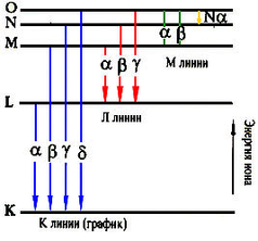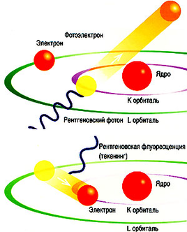Различные электронные орбитали обозначаются K, L, M и т.д., где К – орбиталь, ближайшая к ядру. Каждой орбитали электрона в атоме каждого элемента соответствует собственный энергетический уровень. Энергия испускаемого вторичного фотона определяется разницей между энергией начальной и конечной орбиталей, между которыми произошел переход электрона.