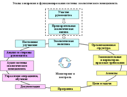 Система экологического менеджмента представляет собой modus operandi для промышленности, необходимый для достижения целей экологической политики и поэтапного решения конкретных задач. Существует четкая параллель между требованиями к организации системы "всеобъемлющего менеджмента качества" TQM (Total Quality Management) и системы экологического менеджмента EMS. Отметим, что ядром философии менеджмента в развитых странах считается всеобъемлющая система качества (ТQM), которая нацелена на эффективном получении качественной продукции и услуг (через весь жизненный цикл - от сырья через производство к жизни самой продукции и окончательному размещению отходов).