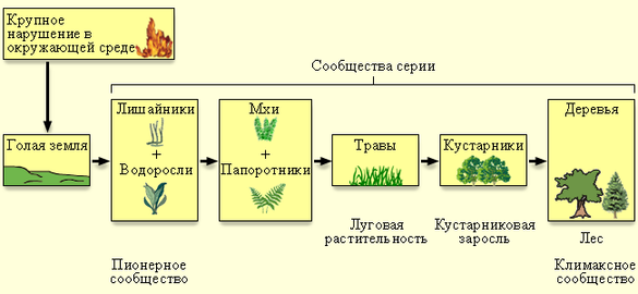 Смена одних сообществ на другими называется экологической сукцессией. Изменение сообщества возможно только при изменении окружающих условий.