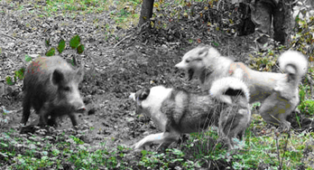 Охота с лайками. Роль собак на этой охоте состоит в том, чтобы задержать зверя на месте до подхода охотника (рисунок 2). Охота на кабана требует злобных и сильных собак. Две-три такие лайки, беспрерывно нападая на кабана, заставляют его кружить на одном месте, останавливаться, отбиваясь от наседающих собак. Секач при этом сам переходит в нападение и, если собаки недостаточно осторожны и ловки, ранит, а иногда и убивает их своими клыками. Особенно трудна и опасна для собак охота в густых зарослях и заболоченных местах. Некоторые охотники используют для охоты на кабана гончих собак. Как правило, это оканчивается гибелью собак. Гончие не столь подвижны, как лайки, и не могут вовремя увернуться от кабаньих клыков.