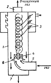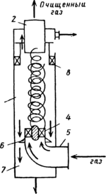 В аппарате соплового типа запыленный газовый поток закручивается лопаточным завихрителем и движется вверх, подвергаясь при этом воздействию трех струй вторичного газа, вытекающих из тангенциально расположенных сопел. Под действием центробежных сил частицы отбрасываются к периферии, а оттуда в возбуждаемый струями спиральный поток вторичного газа, направляющий их вниз, в кольцевое межтрубное пространство. Вторичный газ в ходе спирального обтекания потока очищаемого газа постепенно полностью проникает в него. Кольцевое пространство вокруг входного патрубка оснащено подпорной шайбой, обеспечивающей безвозвратный спуск пыли в бункер. Вихревой пылеуловитель лопаточного типа отличается тем, что вторичный газ отбирается с периферии очищенного газа и подается кольцевым направляющим аппаратом с наклонными лопатками. (рис. 5)