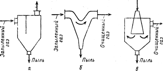 Рис. 1 Инерционные пылеуловители: а – с перегородкой; б – с плавным поворотом газового потока; в - с расширяющимся конусом.