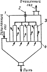 Рис. 6 Рукавный фильтр: 1 – корпус; 2 – встряхивающее устройство; 3 – рукав; 4 – распределительная решетка