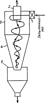 В качестве вторичного газа в вихревых пылеуловителях может быть использован свежий атмосферный воздух, часть очищенного газа или запыленные газы. Наиболее выгодным в экономическом отношении является использование в качестве вторичного газа запыленных газов.