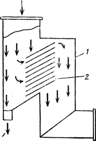 Инерционные пылеуловители. При резком изменении направления движения газового потока частицы пыли под воздействием инерционной силы будут стремиться двигаться в прежнем направлении и после поворота потока газов выпадают в бункер. Эффективность этих аппаратов небольшая. (рис. 1)
