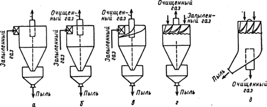 Рис. 3 Основные виды циклонов (по подводу газов): а – спиральный; б – тангенциальный; в-винтообразный; г, д – осевые