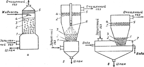 Рис. 8. Газопромыватели с подвижной насадкой: а – с цилиндрическим слоем: 1 – опорная решетка; 2 – шаровая насадка; 3 – ограничительная решетка; 4 – оросительное устройство; 5 – брызгоуловитель; б и в - с коническим слоем форсуночный и эжекционный: 1 – корпус; 2 – опорная решетка; 3 – слой шаров; 4 – брызгоуловитель; 5 – ограничительная решетка; 6 – форсунка; 7 – емкость с постоянным уровнем жидкости