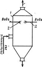 Газопромыватели центробежного действия. Наиболее распространены центробежные скрубберы, которые по конструктивному признаку можно разделить на два вида: 1) аппараты, в которых закрутка газового потока осуществляется при помощи центрального лопастного закручивающего устройства; 2) аппараты с боковым тангенциальным или улиточным подводом газа.