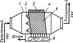 Скоростные газопромыватели (скрубберы Вентури). Основной частью аппаратов является труба-распылитель, в которой обеспечивается интенсивное дробление орошаемой жидкости газовым потоком, движущимся со скоростью 40–150 м/с. Имеется также каплеуловитель.