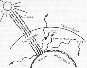 Согласно опытным данным концентрация СО2 в атмосфере за 140 лет увеличилась с 0,027% до 0,033% и продолжает расти. По прогнозу концентрация углекислого газа в атмосфере к 2005 г. может составить от 0,04 до 0,05%, что может привести к повышению средней температуры земной поверхности и нижних слоев атмосферы на 10 °С и подъему уровня океана за счет таяния полярных льдов на 1,5 м. Подобное явление связано с так называемым „парниковым эффектом", который заключается в свойстве атмосферы пропускать солнечную радиацию, но задерживать земное излучение и тем самым способствовать аккумуляции тепла Землей. Лишь в так называемых окнах прозрачности отдача тепла осуществляется почти беспрепятственно (при отсутствии облаков). Наиболее важное окно прозрачности расположено в интервале длины 7—14 мкм. Главный вклад в формирование парникового эффекта вносят водяной и углекислый газ, содержащиеся в атмосфере. Известно, также, что спектр поглощения атмосферы в окнах прозрачности определяется не только влиянием углекислого газа и таких газовых компонентов как озон, фреоны и многие другие, включая и аэрозоли. Схематически явление парникового эффекта представлено на рис. 1. Одни ученые, как, например, У. Болдерс — президент Национального центра изучения атмосферы (США), считают, что парниковый эффект неизбежен, другие ученые-климатологи настроены более оптимистически. Изобилие факторов, оказывающих влияние на климат, не дает возможности определить преимущества каждого из них. Кривая природных колебаний климата сегодня идет вниз к похолоданию, что превышает тенденцию увеличения температуры за счет парникового эффекта. Но по прогнозам в ближайшее время результат взаимовлияния этих факторов должен сместиться в сторону роста температуры.