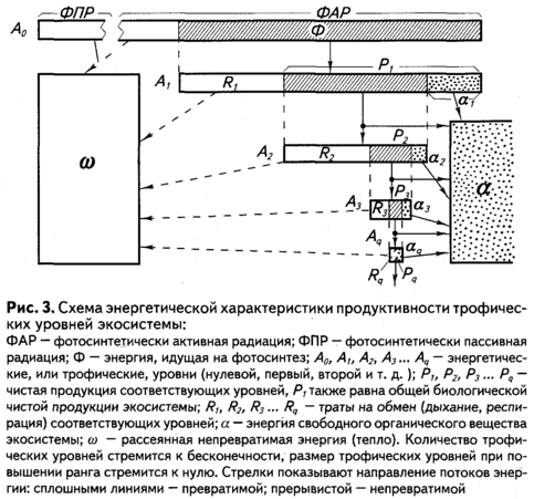 Энергетический принцип изучения трофических взаимоотношений привел к возникновению понятия о трофических уровнях. Это понятие близко к представлениям о цепях питания и пирамидах биомасс. Как уже указывалось, к первому уровню относятся автотрофы, ко второму - гетеротрофы первого порядка, к третьему - хищники первого порядка и т.д. Таким образом, в энергетическом плане сообщество разделяется на ряд соподчиненных ярусов (рис. 3). Это же отчасти отражается и в пространственном расположении организмов, соответственно преломляясь в гравитационном поле Земли в направлении потока солнечной радиации.