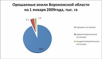 Из-за недостаточного увлажнения на территории области 71,7 тыс. га пахотных земель орошается с помощью мелиоративных систем (рис ). Из них большая часть (68,9 га) находится в хорошем состоянии, но есть и нарушенные земли (1,4 га), находящиеся в неудовлетворительном состоянии.