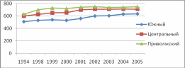 Динамика уровня заболеваемости населения в Центральном, Южном и Приволжском Федеральных округах