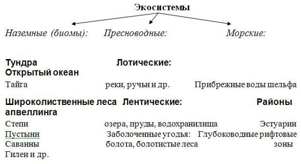 Ю. Одум (1986) выделяет три группы природных экосистем: наземные (биомы), пресноводные и морские.