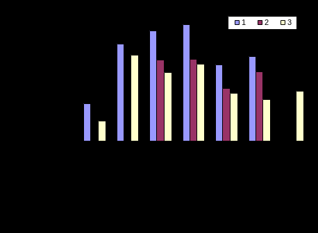 Рис. 1. Видовое разнообразие птиц в населенных пунктах Карачаево-Черкесии: 1 – количество видов, зарегистрированных за все время работ, 2 – количество видов, отмеченных на учетах в застроенных районах и в парках, 3 – количество видов, отмеченных на учетах в застроенных районах
