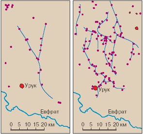 | Рис. 2. Рост числа поселений (точки) и строительство ирригационных каналов (линии) в Месопотамии близ Урука [9]. Левая картинка – ранее урукское время; Правая картинка – позднее урукское время. |