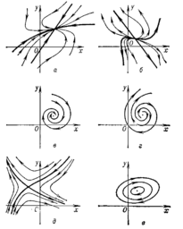 Рис. 1. Фазовые траектории в окрестности особых точек следующих типов: а — устойчивый узел; б — неустойчивый узел; в — устойчивый фокус; г — неустойчивый фокус; д — седло; е — центр.