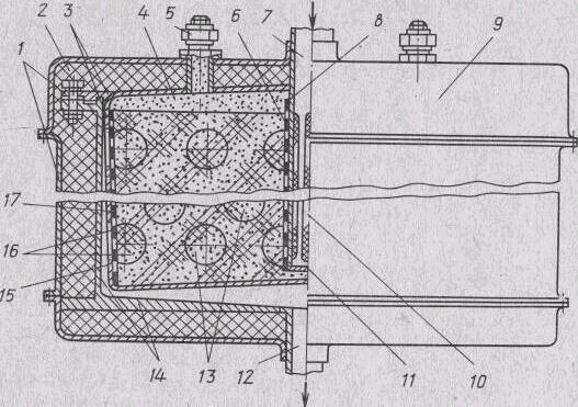 На рис. 1 показана схема адсорбционно-каталитического фильтра для обезвреживания некоторых токсичных органических веществ (аминов, гидразина и его производных). Шихта представляет собой алюмосиликатный меднохромовый адсорбент-катализатор. Масса шихты в аппарате 50 кг, что позволяет задерживать в зависимости от условий фильтрации 5-10 кг токсичных веществ, например, метилового спирта, формальдегида и др.; максимальная температура при окислении кислородом воздуха достигает 530 °С. Фильтр представляет собой корпус 14 с коаксиально размещенной в нем кассетой 3,, содержащей центральный вводной перфорированный трубопровод 8, который соединен с газоподводящим трубопроводом 7, имеющем на наружной поверхности прорези 10, охватываемые металлической сеткой 6. На образующей 17 цилиндрической кассеты 3 выполнены отверстия 16, армированные металлической сеткой 13. Газоотводящий трубопровод 12 размещен в донной части корпуса 14. Корпус 14 защищен теплоизолирующим слоем 2 и имеет съемный кожух 1. В верхней части фильтра находится штуцер 5 для засыпки или ссыпки адсорбента-катализатора. Кассета 3 монтируется съемной относительно корпуса 14.