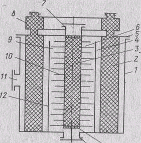 На рис. 2 показана схема такого дополнительного проточно-каталитического фильтра, обеспечивающего доочистку газовых сред, выходящих из адсорбционно-каталитического аппарата. Шихта этого фильтра также представляет собой алюмосиликатный медно-хромовый адсорбент-катализатор, но его масса на порядок меньше, чем масса шихты основного аппарата. Конфузорная 11, цилиндрическая 7 и дифузорная 9 части аппарата разделены сетками 1. На электроизоляции 5 корпуса 2, ограниченного снаружи герметичной камерой 6 с теплоизоляцией 12, имеется устройство 10 для подогрева шихты, например электронагревательная спираль 8. Кроме того, в конфузорной части 11 имеется распределительное газовое устройство 3, соединенное с газоподводящим трубопроводом 4.