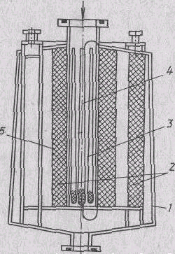 Рис. 4. Адсорбционный насос с обычным адсорбентом-катализатором: 1 - корпус; 2 - кассеты с адсорбентом; 3 - участок входного патрубка; 4 - прорези; 5 - сосуд с хладагентом
