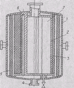 Несколько иным техническим решением отличается адсорбционный насос, показанный на рис. 5. В корпусе 1 насоса коаксиально расположен цилиндрический сосуд 2 с хладагентом, на наружной поверхности которого размещены адсорбент-катализатор 3, и размещена кассета 5. Для подвода регенерирующего газа служит патрубок 4. Цилиндрический сосуд имеет продольные П-образные выступы 7, между которыми в стенке сосуда находятся продольные каналы 6, сообщенные с патрубком 4 для подвода регенерирующего газа и открытые со стороны наружной поверхности сосуда 2.