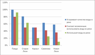 Из диаграммы 1 видно, что идет спад населения, удовлетворенного качеством воды. Количественные показатели жителей, считающих возможным использование воды р. Ляля и пользующихся ею снижается в прямой зависимости удаления населенного пункта от истока реки.