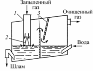 Мокрые газоочистные аппараты ударно-инерционного типа работают по принципу инерционного осаждения частиц во время преодоления очищаемыми газами препятствия или при резком изменении направления движения газового потока над поверхностью жидкости.