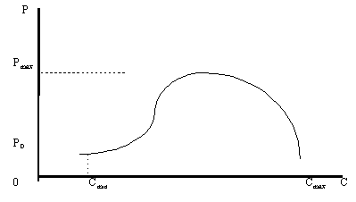 На ось доходов рисунка нанесены два граничные значения дохода - Сmin и Cmax. Первое значение характеризует тот доход, при котором потребитель уже имеет возможность приобретать данный товар в малых ненулевых количествах. Второе значение характеризует тот доход, при котором интересы покупателя полностью переключаются на другой товар.