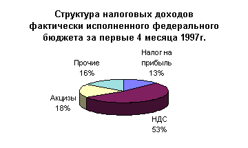 структуре реально полученных в федеральный бюджет налогов за первые четыре месяца 1997 года общая доля НДС, налога на прибыль и акцизов составляет 84% (см. рис. 17).
