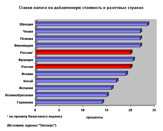 В настоящее время размер законодательно установленных и применяемых в России ставок налога на добавленную стоимость мало отличаются от ставок этого налога, установленных в европейских странах и Китае (см. рис. 18):