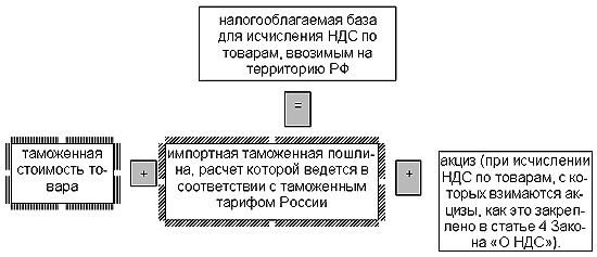 Учитывая, что при проведении внешнеторговых операций (имеется в виду импорт в Россию) со странами дальнего зарубежья товар полностью освобождается от уплаты НДС в стране-экспортере (метод освобождения) либо ранее уплаченный НДС возвращается, налогооблагаемая база для исчисления НДС по таким товарам, ввозимым на территорию России, может быть представлена в виде предлагаемой схемы:
