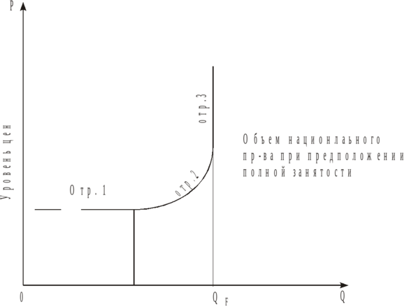 На первом отрезке общие расходы, то есть сумма потребления, инвестиции, правительственных расходов и чистого экспорта, до такой степени низки, что объем национального продукта сильно отстает от своего максимального уровня при полной занятости. Другими словами, существует значительное отставание реального объема ВВП. Уровень безработицы высок, а большая доля производственных мощностей предприятий бездействует. Теперь предположим, что совокупный спрос повысится. Тогда объем производства увеличится, уровень безработицы снизится, а уровень цен возрастет незначительно или вовсе не изменится. Это объясняется тем, что существует огромное количество бездействующих трудовых и материальных ресурсов, которые можно ввести в действие при существующих на них ценах.