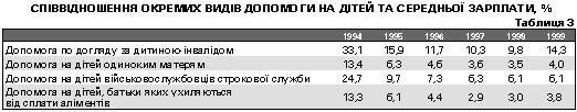 За ідеєю, матеріальними труднощами родин із дітьми за таких умов має перейматися держава. Однак навіть просте порівняння різних видів допомоги на дітей із середньою зарплатою показує, що цього не відбувається. Якщо 1994 року самотня мати отримувала на дитину 13,4% середньої по Україні зарплати, а дружина солдата — 24,7%, то в 1999-му — відповідно лише 4 і 6,1% (табл. 3).