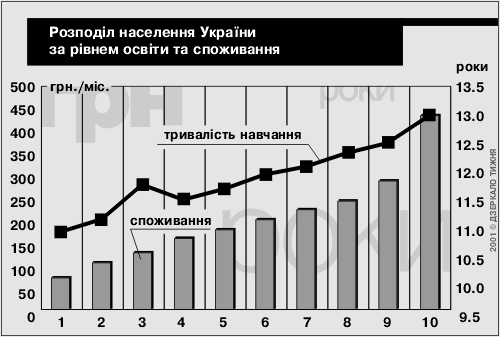Наявність у сім’ї бодай однієї людини з вищою освітою вдвічі знижує ризик бідності. Про збільшення можливостей завдяки освіті знайти роботу й заробити, свідчить і співвідношення в бюджеті родини грошових і натуральних доходів. Якщо в домогосподарствах, де ніхто з дорослих не має навіть середньої освіти, грошові доходи приблизно дорівнюють натуральним, то в сім’ях, де всі дорослі мають вищу освіту, грошові доходи вчетверо перевищують натуральні.