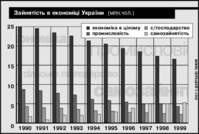 Скорочення обсягів виробництва й відповідне зниження попиту на робочу силу обернулося зниженням зайнятості, насамперед у промисловості, будівництві та сільському господарстві, які традиційно визначали структуру ринку праці України, призвело до поширення вимушеної неповної зайнятості, зростання рівня і тривалості безробіття. У промисловості, яка колись визначала обличчя вітчизняної економіки, ці негативні процеси виявилися настільки суттєвими, що чисельність працюючих тут нині поступається чисельності само зайнятих (включаючи тих, хто працює в особистому підсобному господарстві).