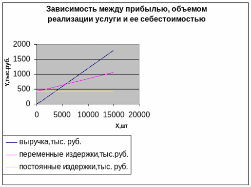 По горизонтали показывается объем оказания услуг (печать станиц), по вертикали себестоимость услуги и прибыль, которые вместе составляют выручку от реализации.