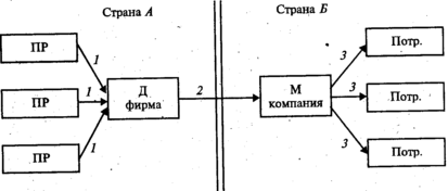 1 — закупка дочерней фирмой (Д фирма) продовольственных товаров у производителей (ПР);