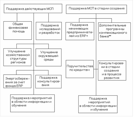 Из рисунка 1 видно, что, во-первых, государственная финансовая поддержка сопровождает МСП на всех стадиях его развития, во-вторых, она носит четкий целевой и адресный характер, предопределяемый макроэкономическими и социальными приоритетами. Если к тому же принять во внимание, что допускается комбинирование различных источников и мер поддержки - например, фирма, находящаяся в процессе создания, может получить помощь также и в рамках программ по поддержке уже действующих предприятий, - то становится понятно, что система финансового стимулирования малого бизнеса в ФРГ представляет собою довольно густую и прочную сеть. При этом отдельные звенья этой сети, в свою очередь, обнаруживают разветвленную внутреннюю структуру.
