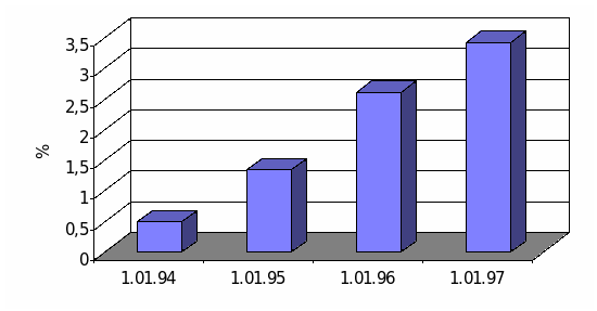 В 1994 году наибольшая продолжительность безработицы была от 1 до 4 месяцев (39,5%) и от 4 до 8 месяцев (25,6%). В 1997 году наибольшая продолжительность безработицы также наблюдалась в период от 1 до 4 месяцев. Третья часть безработных находилась в так называемой “застойной” безработице (от 8 месяцев до года), которую формировали, в основном, женщины (75,9%) и молодежь (30,6%).
